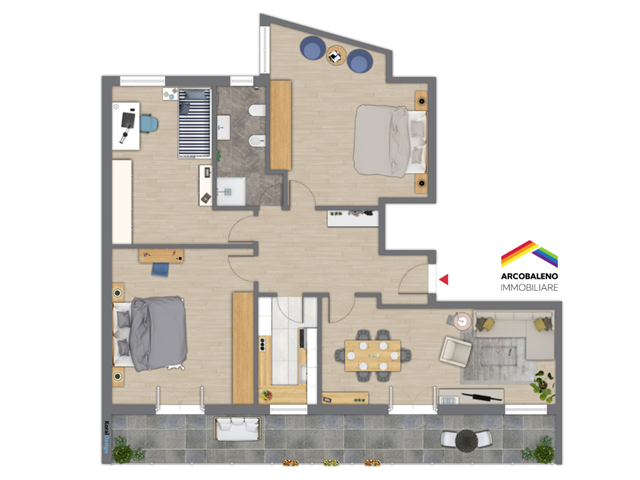 Appena varcata la soglia, colpisce l’ampiezza dell’ingresso, vero cuore distributivo dell’abitazione. Il salone, generoso nelle dimensioni, si affaccia su un terrazzo vivibile lato ovest, perfetto per godersi il tramonto in pieno relax. La cucina semi-abitabile, funzionale e ben organizzata, è dotata di piano snack per colazioni veloci.
